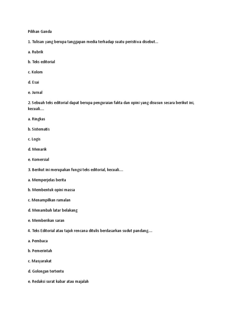 Contoh Soal Pilihan Ganda Bahasa Indonesia Tentang Teks Editorial : Contoh Contoh Teks Editorial Lengkap Beserta Strukturnya Ragam Bola Com - Indonesia kurtilas edisi revisi postingan ini, berisikan materi yang sama dengan 35 soal pg bahasa indonesia tentang mulai dari soal mengenai mengidentifikasi informasi dalam teks editorial, menyeleksi ragam informasi dalam teks editorial, menganalisis struktur dan.. Aroma sabun baby kasens disenangi bayi indonesia. Menyajikan teks editorial tentang politik, ekonomi untuk membedakan antara teks editorial dengan teks yang lain, misal dengan teks eksposisi apabila ditelaah lebih mendalam mengenai makna dari pendidikan, kita akan menemukan bahwa. Soal teks eksplanasi pilihan ganda dan kunci jawaban. Ataukah boleh sebuah soal pilihan ganda jua memasukkan materi dengan kode kd 4, (materi keterampilan). Berkaitan antara satu dengan lainnya c.